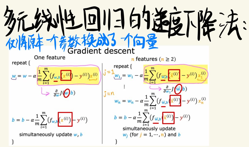 多元线性回归的梯度下降法,仅将原本一个参数换成了一个向量。
