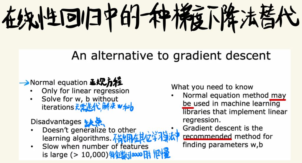 所以梯度下降法完全优于正规方程,推荐使用梯度下降法,但是你又可能会在线性回归问题中看到正规方程的使用,只需了解即可。