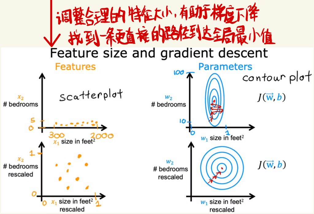 调整合理的特征大小,有助于梯度下降,有助于找到一条更直接的路径达到全局最小值。