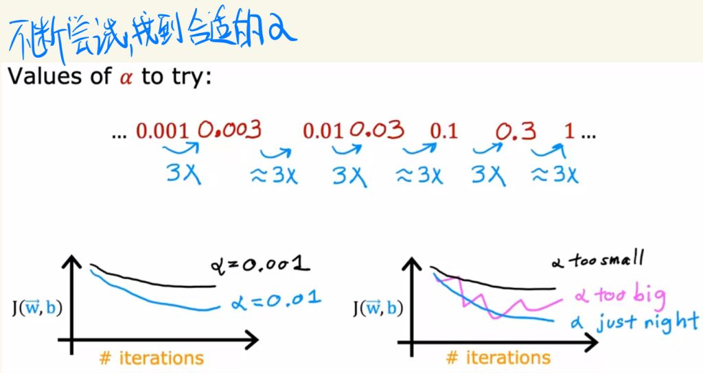 可以通过不断尝试,找到合适的学习率α值。