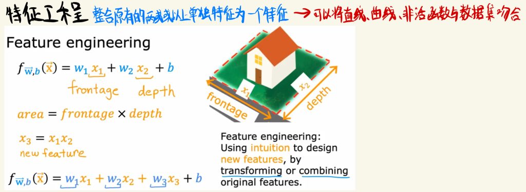 特征工程就是整合原有的两个或以上单独特征为一个特征。这样可以将直线、曲线、非活函数与数据集吻合。