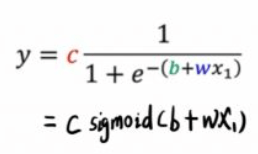 sigmoid函数在机器学习中非常重要,很多地方都会再提到,上面这个虚线就是sigmoid函数本体了,它的表达式是下面这样,后面我们通常会简写成 y = c sigmoid(b + wx1):