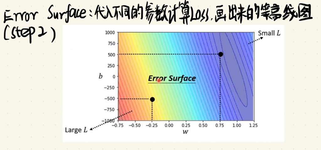 根据上面的step,接下去就是将每一个参数都代进L(w, b)中计算Loss了。我们可以将这些Loss算出来之后画出一幅等高线图,这个就是Error Surface了。