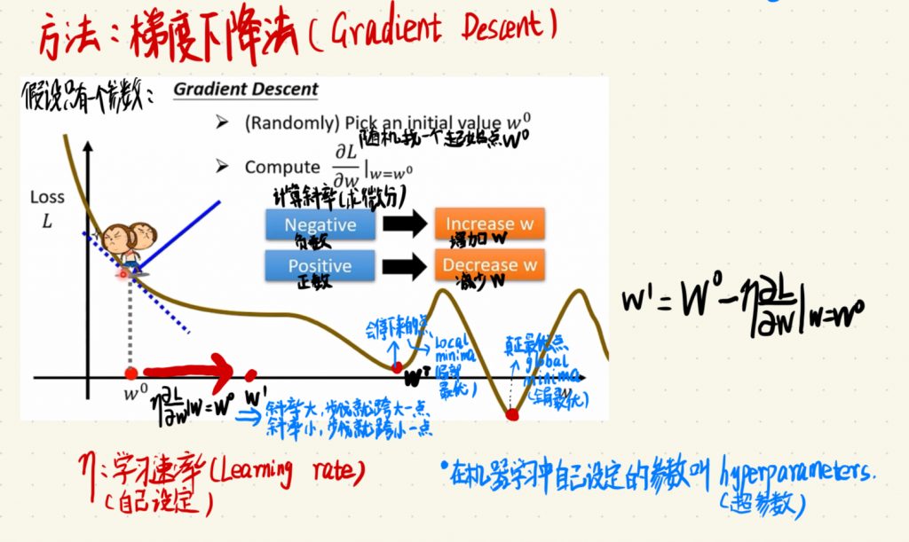 看上面的笔记我们首先发现了两个新的名词,我们就先对于他们作出解释。η是学习的速率(Learning rate),可以看到它与斜率相乘才决定了步伐的大小,也就是说η可以决定训练的快慢,与斜率不同的是η这个参数是由我们模型的训练人来决定的,我们可以自己自由控制它的大小。同时引出了新的概念,也就是机器学习中自己设定的参数叫做超参数(hyperparameters)。