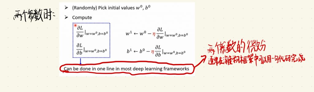 这里的步骤其实和刚刚说的差不多,我们会随机选取的参数变成了两个,分别是w0和b0,然后我们在计算斜率的时候会分别对w和b求对于L的微分。这里值得一提的是,两个参数的微分计算,通常可以在深度学习框架中用一句代码完成。