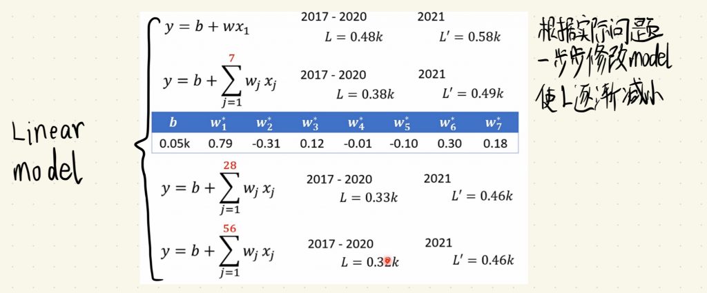 完成了以上三步,可以说我们完成了一次机器学习,但真正的机器学习肯定没有那么简单,实际上比这要复杂的多。让我们回到step1的Model上面,刚才我们选取的模型是 y = b + wx1 这个函数,下面老师将这个模型用在真实生活中会产生的数据上面,这个数据是老师的YouTube账号的观看人数假设,那么算出来了2017-2020年观看人数,这个数据对于我们这个场景下来说是已知的数据,我们可以将这些数据称之为训练集,那我们算出对于训练集来说的L的值,假设说是0.48k。然后我们在计算一下2021年(假设这里2021年的数据是未知的)的L,那这里2021年的数据也就是我们的预测值,这里假设我们得到的损失值L’是0.58k。那刚才的情况是以天为单位的,我们知道每天观看YouTube视频的人数肯定会有不同,比如说星期一到星期五观看老师课程视频的人数就会多一些,因为是教学视频嘛,那到周末的时候观看教学视频的人数就会少一些,这样比较符合常理嘛,因为大家可能在周末休息。虽然说每一天的数据会有很大差异,但是以周为单位这样的差距就会小一些了。所以我们可以使用刚才说的有两个参数的Model,通过调整函数中的w和b的值可以制造出新的函数,这里我们调整w的值(具体如下图所示),我们先以7天为一个单位来看,通过计算我们发现2017-2020的L是0.38k,2021的L’是0.49k。我们发现比刚才得到的损失要小了一些,说明我们的模型效果变得更好了一些!那既然以周为单位效果变好了,那我们以月为单位,甚至以年为单位呢,按理来说我们的模型效果会变得更好一些。没错,根据实际问题一步步修改我们的Model,可以使L逐渐减小,也就是让我们的模型变得更好。顺带一说,刚才提到的这些Model都叫做Linear model,字面意思,他们都是直线函数。