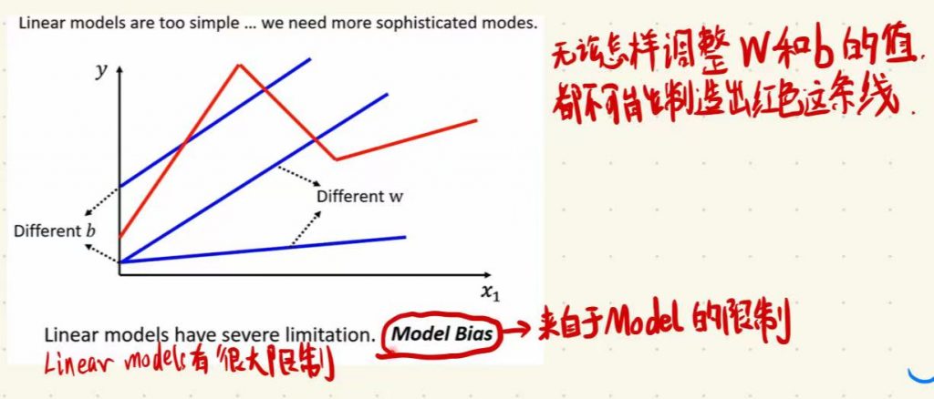 以上我们说的Model都叫做Linear model,它们不仅不完美,还有非常多限制,比如说下面这个例子,就是无论怎样调整w和b的值,我们都不可能制造出下面这条红色的折线函数。