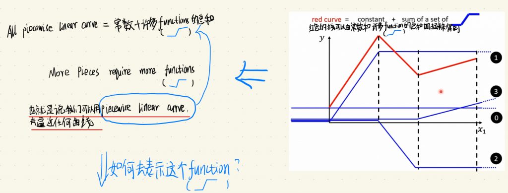 这是来自于Model本身的限制,我们叫做Model Bias。请注意,这里的Bias和我们之前model(函数)里的b不是一个意思。于是,想要我们的模型更加完美,我们需要写出更加复杂的函数。上面的这条红色函数既然不能用一个函数完美表示,那么我们是不是可以用很多一个function(函数)去表示它呢?没错,这就是解决的办法,这条红线的线可以由常数和许多function的总和加起来得到,这个function的样子还有点特别啦,像反转过来的Z,具体我们可以看下图。