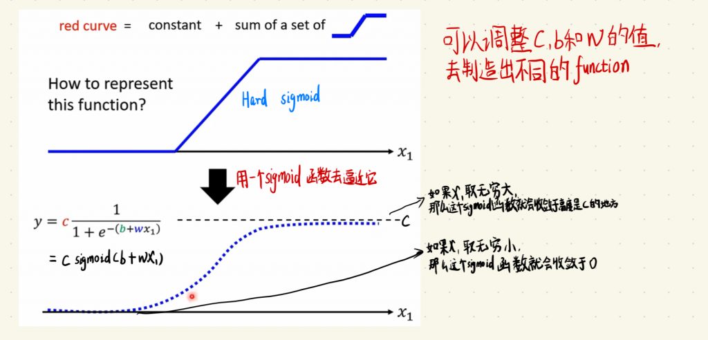 我们通过将常数和许多function加起来得到了更加复杂的函数,All piecewise linear curve都可以由常数加上许多function的总和得到,再进一步说,我们可以用piecewise linear curve去逼近任何像上面红色函数那样的曲线。这样无论多复杂的曲线都可以表示出来了,无非就是function用的多少而已,用的越多自然表示出来的函数就越复杂。那么问题又回来了,我们该如何去表示这个function呢?下面就该机器学习中大名鼎鼎的sigmoid函数出场了!