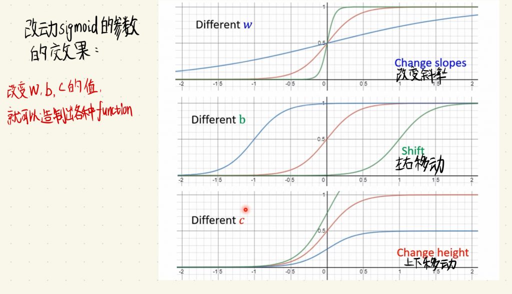 sigmoid式子里的c是个常数,可以由我们自由调整它的大小,后面会具体说明它的用处。观察式子,我们可以发现sigmoid函数的一些特征。如果x1取无穷大,那么这个sigmoid函数就会收敛于高度是c的地方;如果x1取无穷小,下面的分母就会无穷大,最后这个sigmoid函数就会收敛于0。这里我们会发现c、b和w这些参数都是我们可以去修改的,通过修改这些参数我们就可以制造出各种不同的function。这里顺带一提的是,刚才我们组成那条红色函数用到的function就是一种特殊的sigmoid函数,我们将其称之为Hard sigmoid。下面是c、b和w改动后对于sigmoid函数的效果:
