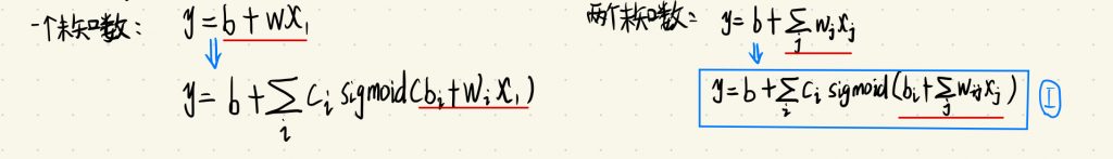 于是,通过sigmoid函数,我们改进我们的模型,让我们的模型实现了线性到非线性的飞跃。这里请注意在图中标的一个未知数和两个未知数都表示的是w下标的个数,并不是指参数的个数。