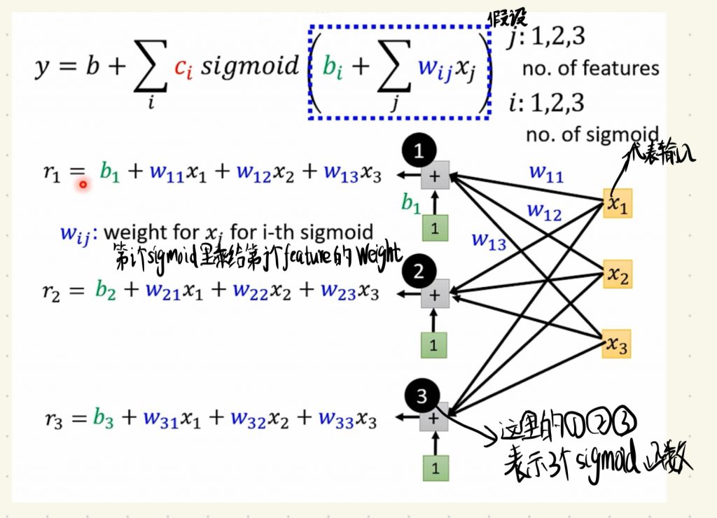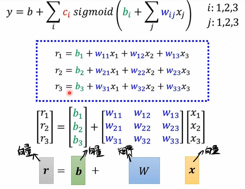 这里的i表示不同的sigmoid函数,j表示feature的编号,为了方便理解,我们还是用上面那个YouTube的例子,假设这里的j表示的就是前i天,然后我们输入的xi就表示前i天的频道观看人数。上图黑色圈里的编号就表示这是第i个sigmoid函数。式子中的wij表示的是第i个sigmoid函数里乘给第j个feature的weight。为了方便起见,我们将sigmoid括号里的式子表示为ri。接下去的理解可能需要一些线性代数方面的知识,下面为了方便和简洁性,我们用线性代数的角度去解释上面关于r的式子。