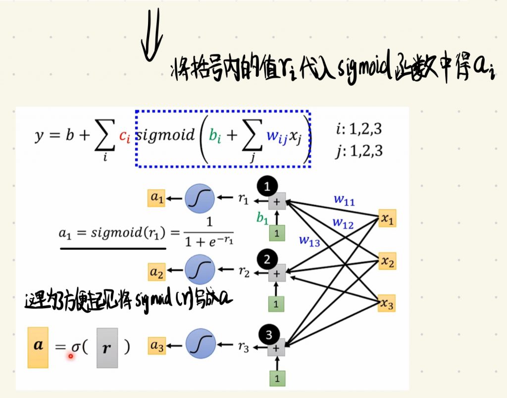 注意上面的式子并没有进行计算,只是在线性代数的角度解释了r的计算。值得注意的是,这里的r、b和x都是一个向量,w是一个矩阵。再然后根据式子,就该将r代入sigmoid函数中进行运算了。