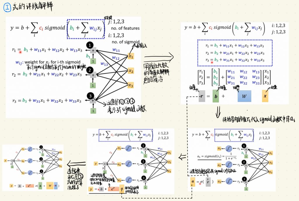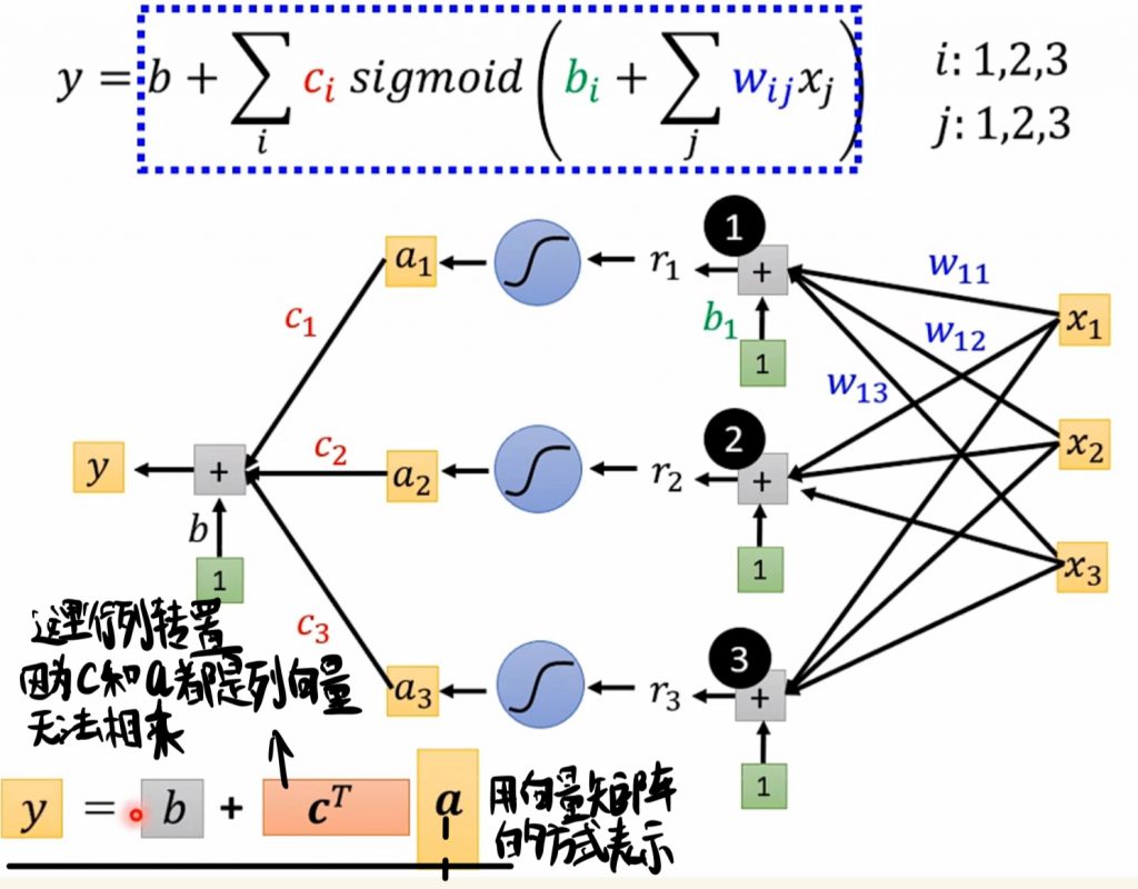 接下去就应该比较好理解了,就是将sigmoid计算出来的ai乘上常数ci全部加起来,最后再加一个常数b就可以得到我们的输出结果y啦!这里在用向量矩阵的方式表示的时候有一个需要注意的点,就是我们将常数ci组成的向量进行了行列转置,在右上角写个大写的T就表示行列转置,因为一开始我们定义的向量c和a都是列向量,两个列向量的形状决定了它们不可以相乘,于是行列转换之后它们的形状变成了1 * 3 和 3 * 1,这样两个形状的向量就可以进行相乘了。