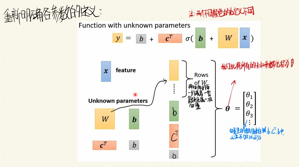 首先这里的x表示的是feature。其次是我们的四个未知数W、c和两个b,请注意这里绿色的b和灰色的b表示的含义是不同的。我们将矩阵w的每一列或者行拿出来变成一堆向量,然后我们将这堆向量和两个b和cT向量共同定义为θ,也就是说我们将所有未知数统一称为θ,这个向量θ里的θ1、θ2、θ3…的数值都来自于w、两个b和c当中,但是在这里我们就不加以区分了。