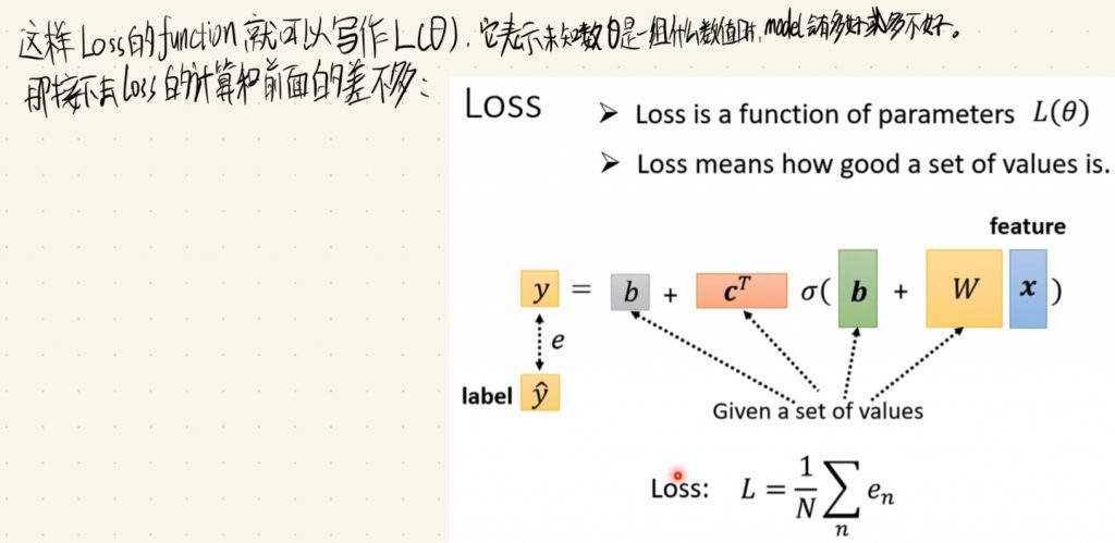 这样Loss的function就可以写作L(θ),它表示未知数θ是一组什么样的值时,model会有多好或者多不好。那接下去Loss的计算就和前面说的差不多了。