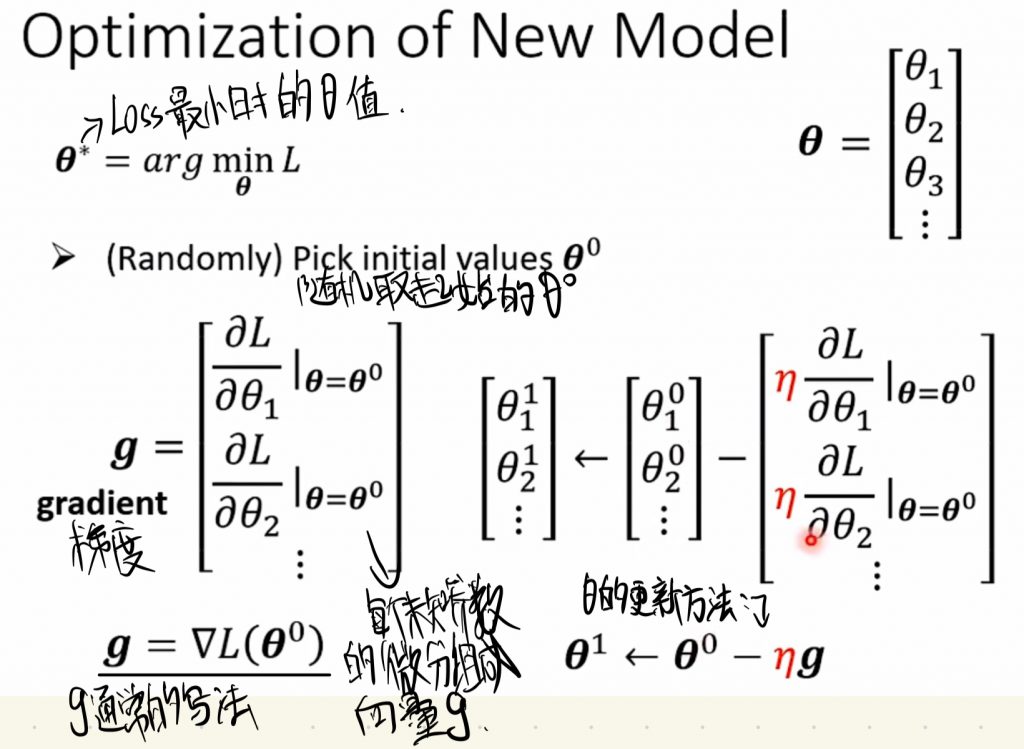 方法其实和之前两个参数的时候也差不多啦。我们的目的还是找Loss的最小值,我们用θ*来表示Loss最小时候的θ值。然后还是和之前一样随机取一个起始的值θ0,接下取就是和之前一样求微分,只不过这里我们的参数不止一个了,所以我们需要对所有未知数都求微分,所有未知参数的微分就组成了向量g,这里的g有个专有的名词叫做梯度(gradient)。g的通常写法在上图有写,就是一个倒三角加上L(θ)。更新θ的方法也和之前一样,只不过多了很多参数,和之前一样,将现在的θ值减去学习率乘上梯度的值就得到了新的θ值,这样我们就完成了对θ的更新。接下去就是一直重复更新参数直到找到斜率为0的点或者我们主动停止程序了,这里因为参数变多,计算量也是成倍增加,所以一般来说我们是不太可能找到斜率是0的点,一般来说都需要我们自己去手动设定程序什么时候暂停。