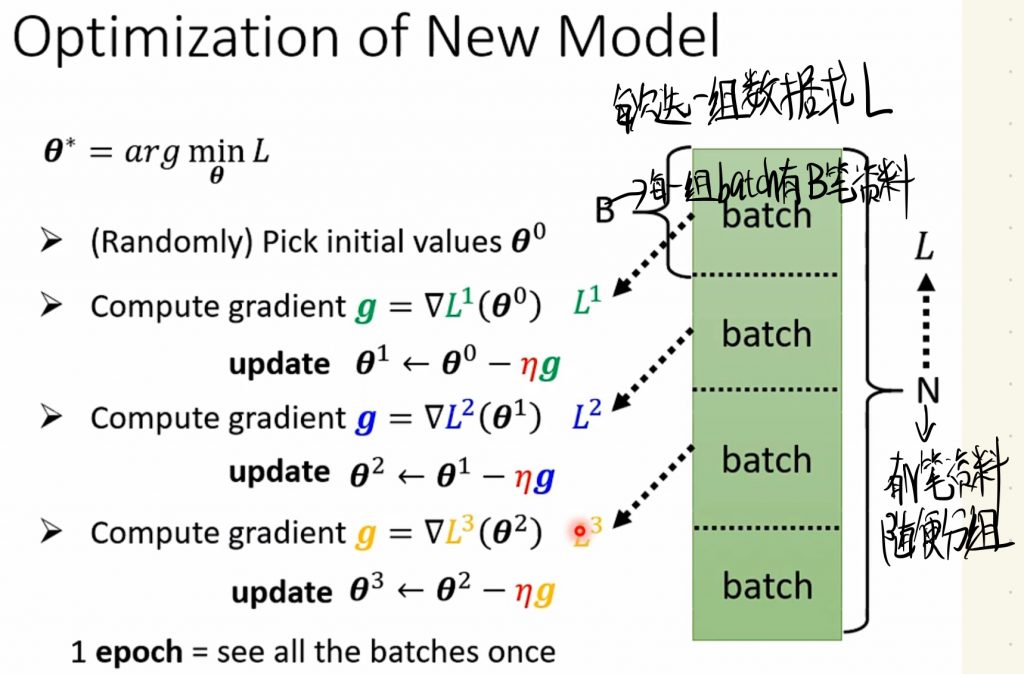 具体来说明,假设这里有N笔用于训练的数据,我们将这些数据随便平均分成一组一组的数据,每一个batch中有B笔资料假设说。然后我们每次选一个batch的数据求L,也就是求梯度g,然后将求出来的g用于θ的更新,以此类推我们不断更新θ。将所有batch都计算完更新完参数后,我们称之为1 epoch;每一次的更新参数θ,我们都称之为一次update。所以实际上我们并不是用大的N的L去更新参数,而是分成一个一个batch去更新参数。这里值得说明的是,epoch和batch size 都是我们可以自己定义的超参数。