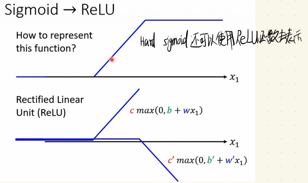 这样实际上我们用两个ReLU函数就可以表示出刚刚的Hard sigmoid函数。这里就引出了继续学习中著名的名词——激活函数(Activation function)了,sigmoid函数和ReLU函数都是激活函数,激活函数的意义其实也在一开始就体现了,就是表示不同的function。