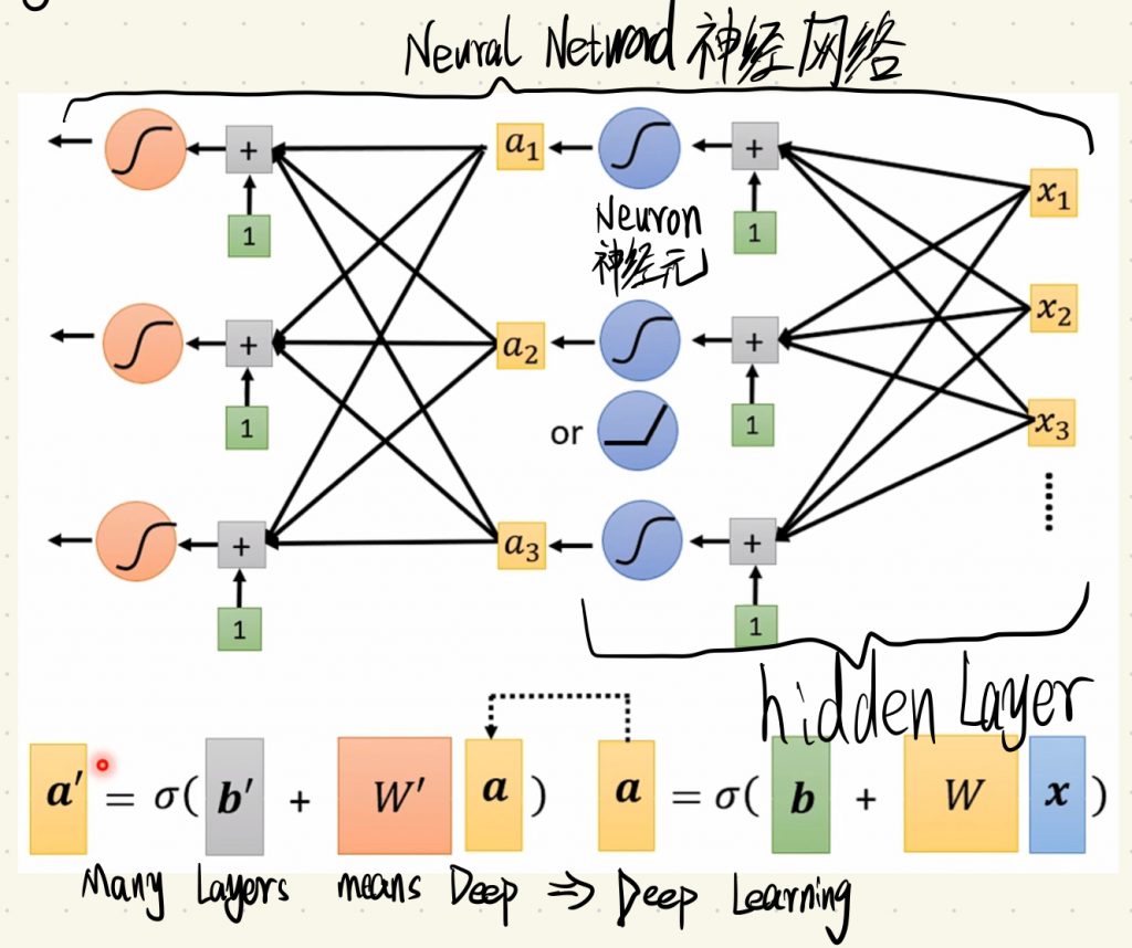上面每一个激活函数都叫做神经元(Neuron),它们组成的网络就叫做神经网络(Neuron Network)。里面的每一层计算都是神经网络中的一层隐藏层(hidden layer)。有许多层就意味着Deep(深),所以这种技术就叫做深度学习(Deep Learning)。深度学习是机器学习的一个部分,本次李宏毅教授的机器学习课程主要就是对深度学习这门技术的学习。