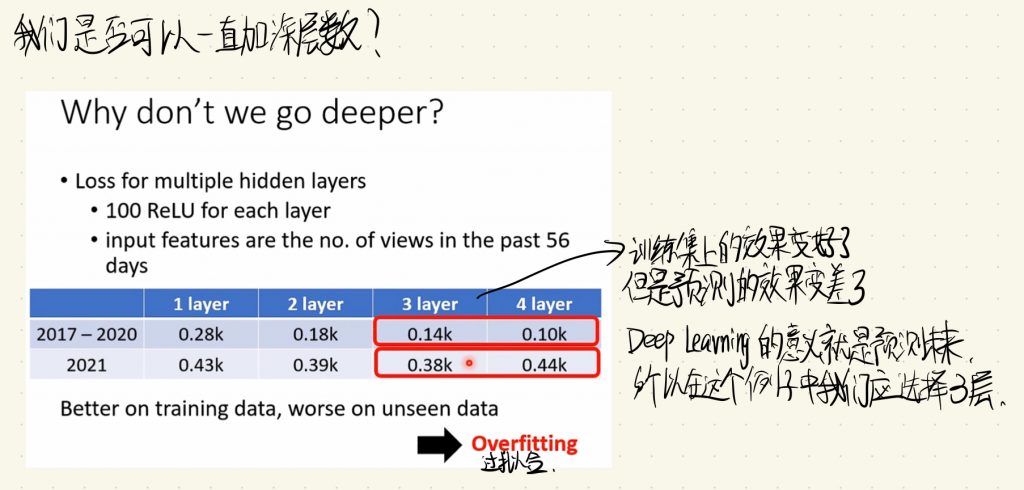 在这个例子当中,我们发现虽然加深到4层的时候,在2017-2020(训练集)中的数据效果比3层要好,但是在2021的预测当中的效果不如3层的神经网络,这种现象就称之为过拟合(Overfitting)。Deep Learning的意义就在于用现有的数据预测未来,所以在这个例子中4层网络对于我们的意义就不如3层。也就是说,我们不可以一直加深层数来达到一直优化模型效果的目的,我们需要抑制过拟合的产生。