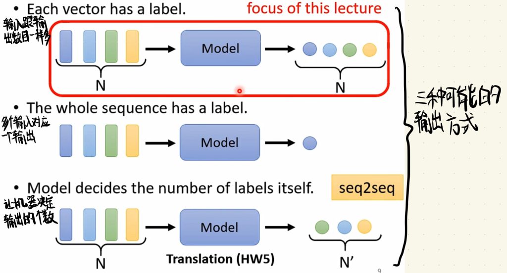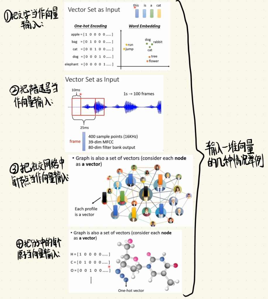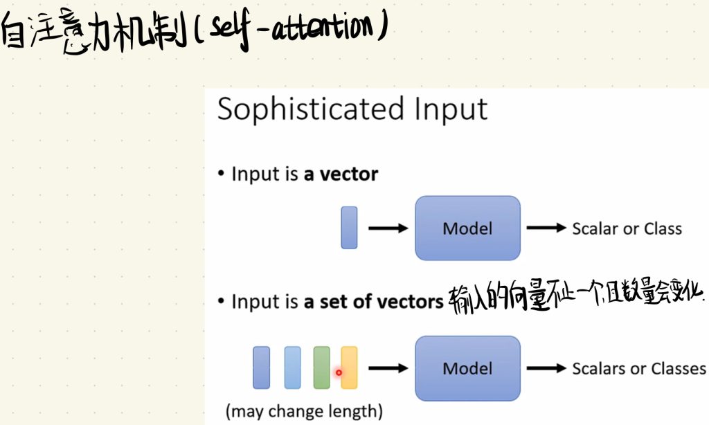 那之前我们都是输入一个向量进入我们的模型中,然后得到一个输出,如果输出的是一个量(Scalar),我们做的就是回归(Regression),如果输出的是一个类(Class),那我们做的就是分类(Classification)。那如果今天我们要输入的是多个向量,并且这个输入向量的数量又会时刻变化,我们又应该怎么去做呢?