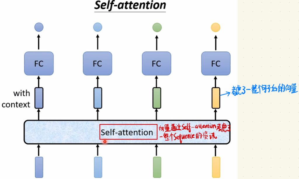 我们把一个Sequence的向量全部一起丢到这个Self-attention层里面,向量通过Self-attention层后考虑了整个Sequence的资讯,然后输入一排经过Self-attention层后考虑过一整个句子后的向量,最后我们只需要将这一排向量放到全连接层里面得到最终的输出就可以了。
