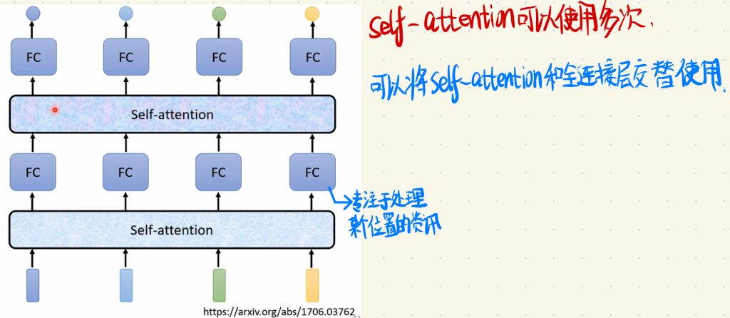 当然,整个Self-attention层也可以使用多次,你可以把Self-attention层和全连接层不断重复去处理数据。