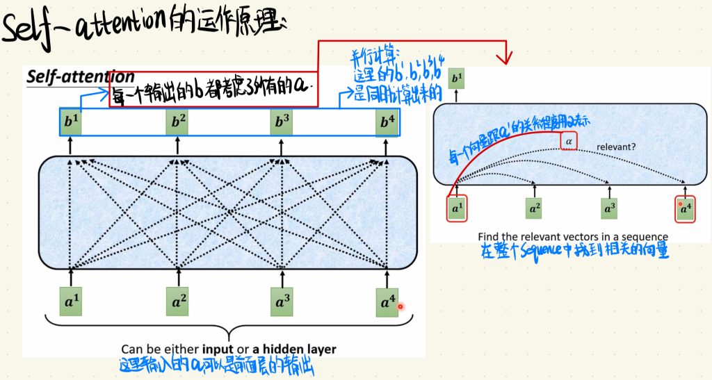 简单来说,这里每一个输出的b都是考虑了所有的输入a之后得到的。当然,这里输入的a也可以是前面层的输出。那这里输出的b是如何确定每一个a的重要性的呢?换个问法,就是这里的每一个输出b都是如何在整个Sequence中找到相关的向量的呢?