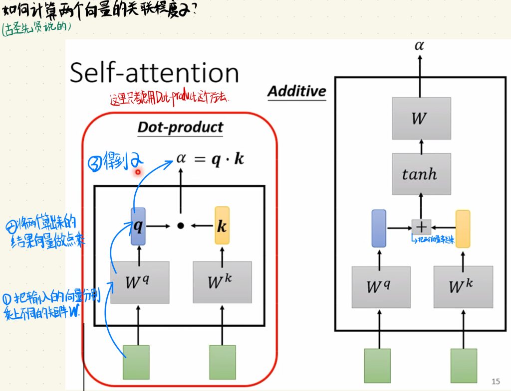 我们先把输入的向量分别乘上不同的矩阵W,然后将这两个算出来的结果做点乘(Dot-product),最后我们就得到了关系系数α。