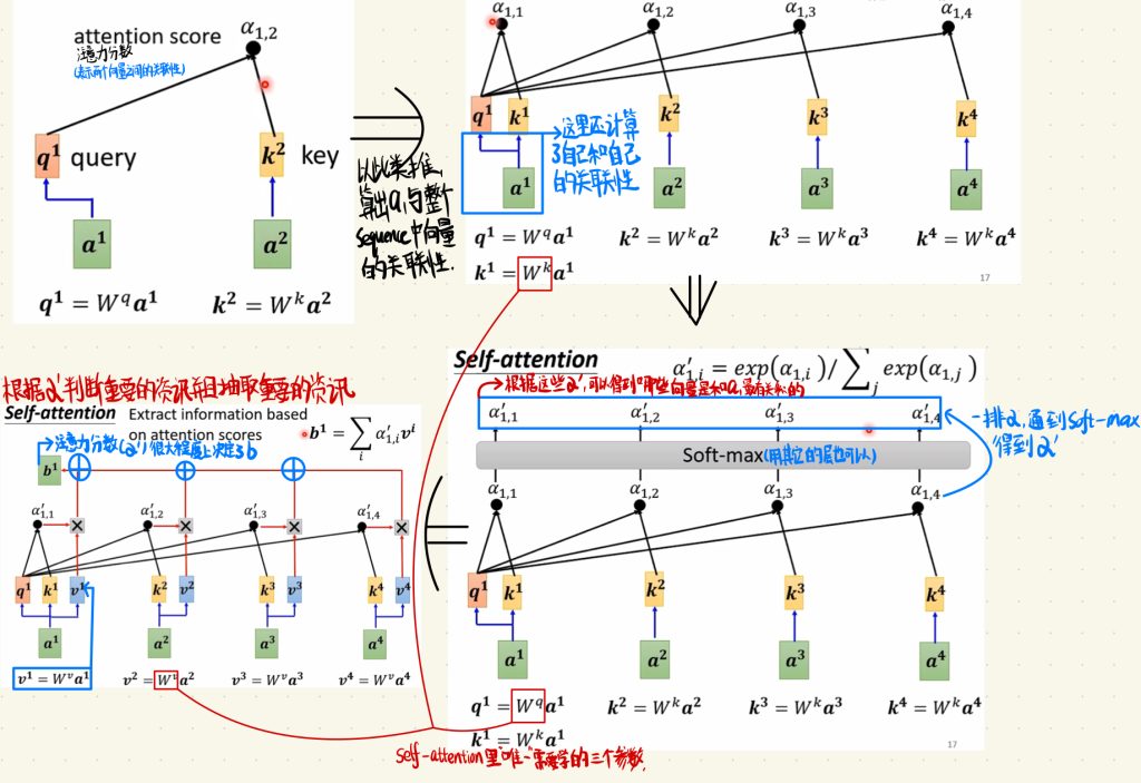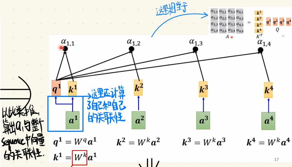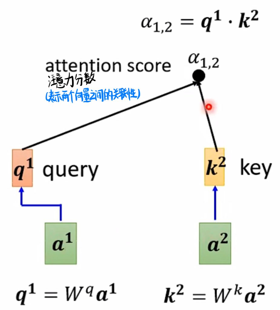 我们换种方式来解释这个α是如何产生的,就是先把要处理的a1乘上一个矩阵Wq,得到一个向量q1,那这个q1有一个专有的名词query。然后这个Sequence的其他剩余向量乘上一个矩阵Wk得到一个k2,这个k2也有一个专有的名词叫key。那这个α我们也给一个专有名词叫注意力分数。比如上图中,我们就计算出了a1和a2这两个向量的关系,我们记作α1,2。
