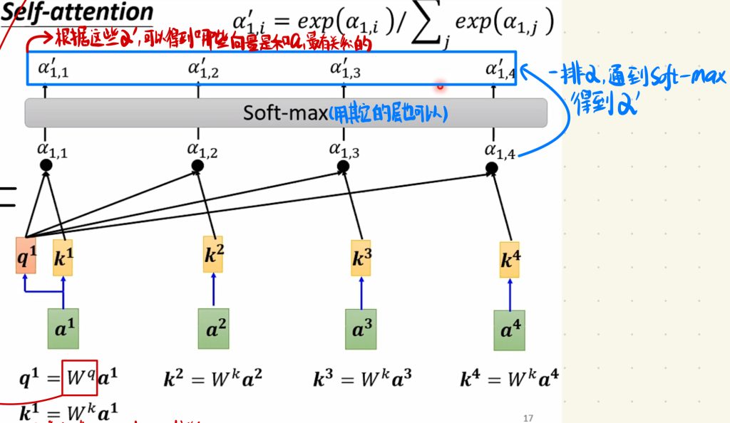 最终通过Soft-max层后,我们得到一排α’,根据这些α’,可以得到哪些向量是和a1最有关系的。