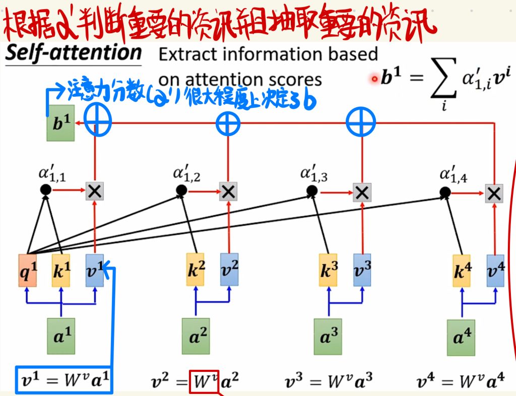 也就是说Self-attention层中根据α’判断重要的资讯,并且抽取重要的资讯。最后我们再引入一个需要学习的矩阵Wv,我们再将所有的输入a乘上Wv得到一个向量v。最后,我们将这个向量v乘上每一个分别的相关系数,最后把每一个算出来的结果全部加起来,就得到了一个输出b。从这里我们也不难看出,最终的输出结果和这个注意力分数α’有着很大的关系,也就是说,注意力分数α’很大程度上决定了输出b。