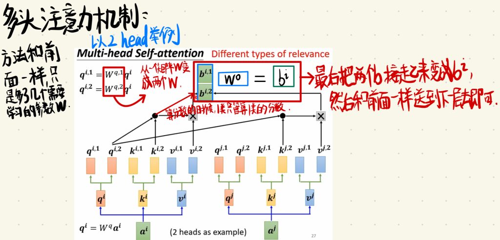 相关这件事情啊,它也有很多不同的形式,有很多不同的定义。所以,也许我们不止要有一个q(query)去表示不同种类的相关性。这个时候,我们就需要多头注意力机制。
