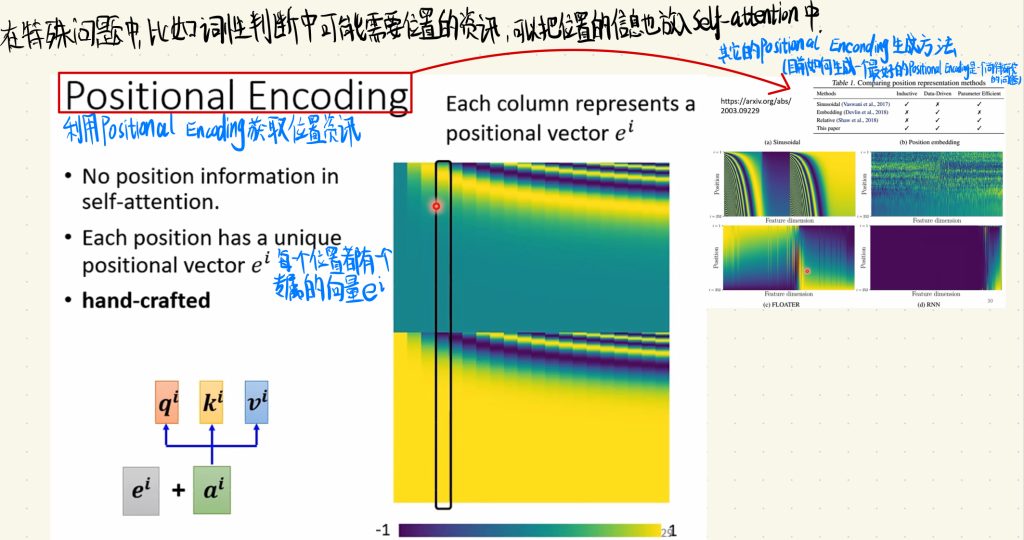 在处理一些特殊的问题当中,比如词性判断中可能需要位置的资讯,于是我们就可以把位置的信息也放入Self-attention中。