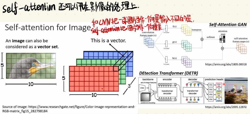 在CNN当中,我们将一张图片处理成一个向量输入到全连接层当中。和CNN不同的是,Self-attention把图片当作一个向量集(Sequence)去处理。最后利用Self-attention也依旧可以达到我们的目的。