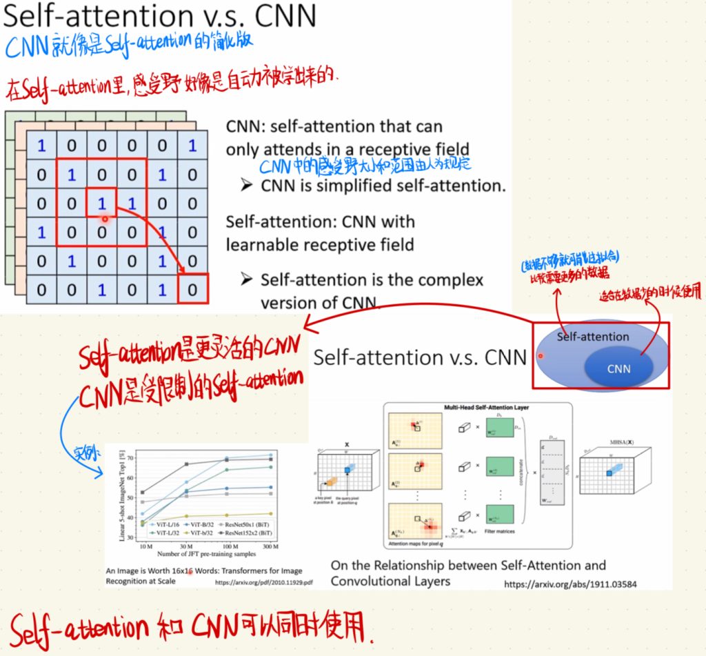 简单来说,CNN就像是Self-attention的简化版。Self-attention是更灵活的CNN,反过来说,CNN是受限制的Self-attention。在CNN中,感受野的大小和范围由人为规定。而在Self-attention中,CNN里面讲的感受野就好像是自动被学出来的。画图的话就是,Self-attention中包含了CNN。但是Self-attention需要更多的数据,如果数据不够就可能发生过拟合,而CNN的好处是适合在数据少的时候去使用。