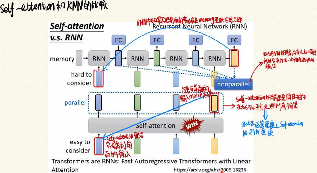 RNN是输入一个数据,然后通过RNN层,将输出给到全连接层,然后再输入一个数据,再通过RNN,然后RNN会考虑一次周围输入的参数再给出输出,接着再把这个输出放到全连接层当中,然后再输入一个数据,以此类推。但是这样子的话,RNN中如果不把前面的输入存在memory里,它就容易忘掉。因为RNN的输出有先后顺序,所以它没有办法一次平行处理所有的输出。而通过前面对Self-attention的介绍,我们就不难看出,Self-attention更容易考虑到前面的输入,它能与前面的输入配对(match)起来。因为Self-attention的输出是同时的,因此它可以平行处理所有的输出,也就是说在运算速度上Self-attention也比RNN更快。
