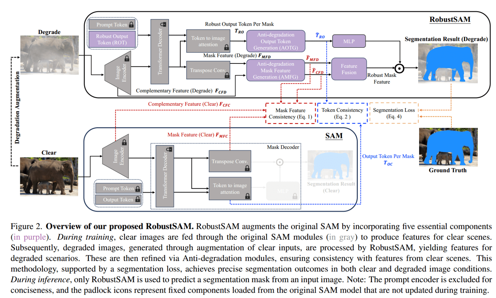 对此文章提出了一种新的方法,RobustSAM,它在保留SAM的零样本学习能力的同时解决了图像退化问题。