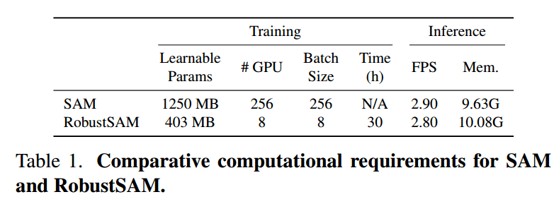 在RobustSAM的训练阶段,保持预训练的SAM参数冻结,只专注于优化所提出的模块的鲁棒性,以此来节省计算资源。