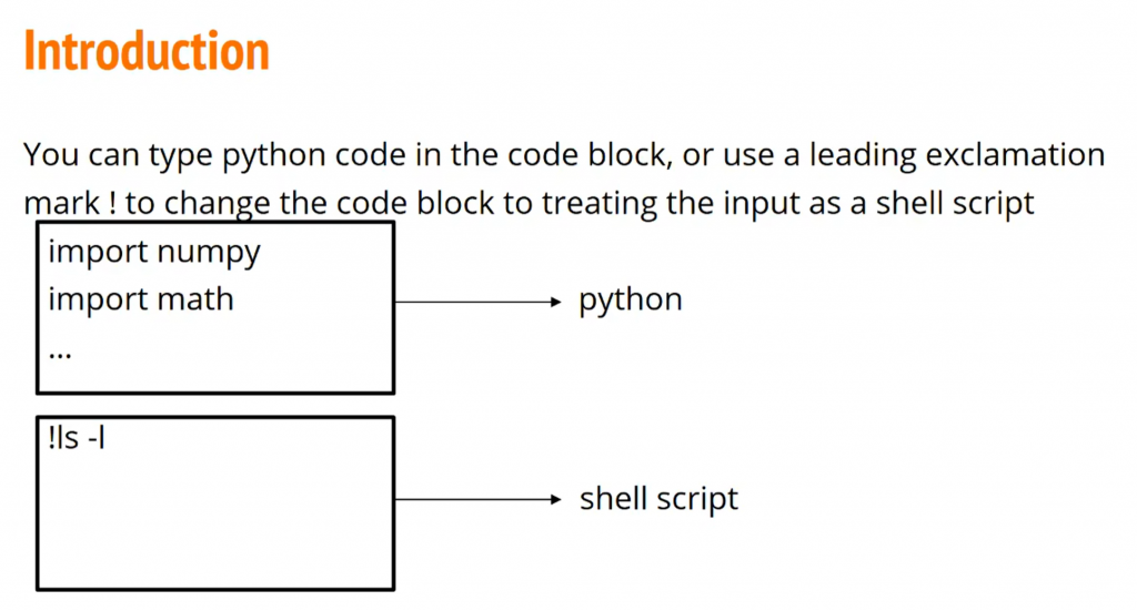 代码格中,你可以直接写Python代码,或者你也可以运行命令行shell script命令,但是别忘了要在前面加个惊叹号(!)。