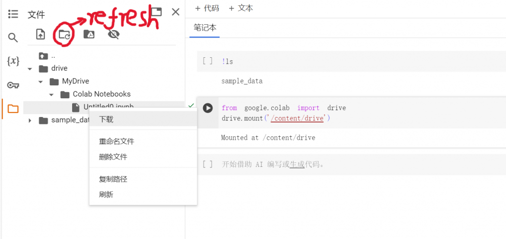 我们屏幕的左边会有一个文件的管理器,我们可以找到代码中运行出来的文件,然后将它们下载到本地,请注意,因为Colab是个云端上运行代码的工具,所以在运行完程序以后会删除程序运行之后的结果文件,因此如果你想保存它们最好将它们下载的本地,当然,我们也可以用这个办法下载我们在Google Colab上面写的代码,格式是.ipynb格式。那要是你的文件可以比较乱,找不到你要的文件的话,你就可以点上图那个红圈里的键去refresh一下。