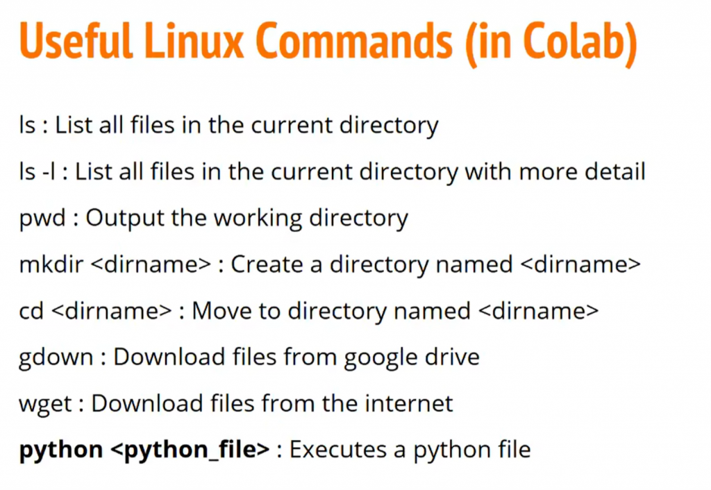 下面是一些在colab中常用的命令,前面的!省略: