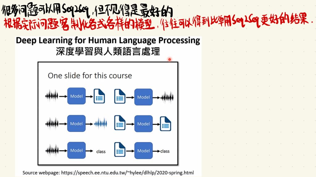 但是有很多问题可以用Seq2Seq,但不见得是最好的。我们还是需要根据实际问题客制化各式各样的模型,这样子往往可以得到比单用Seq2Seq更好的结果。