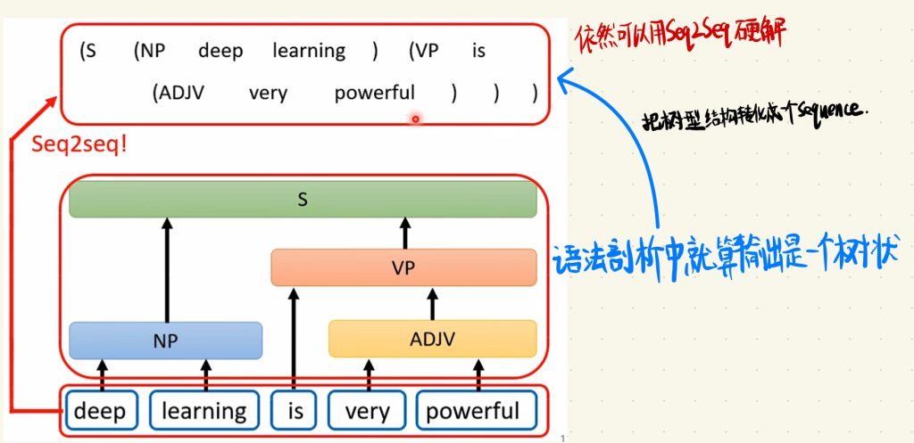 还有一些问题中,可能输出都不是一个Sequence,我们依旧可以用Seq2Seq。比如在语法剖析的问题当中,就算输出是一个树状,我们可以把树形结构转化成一个Sequence,然后依旧可以用Seq2Seq硬解这个问题。