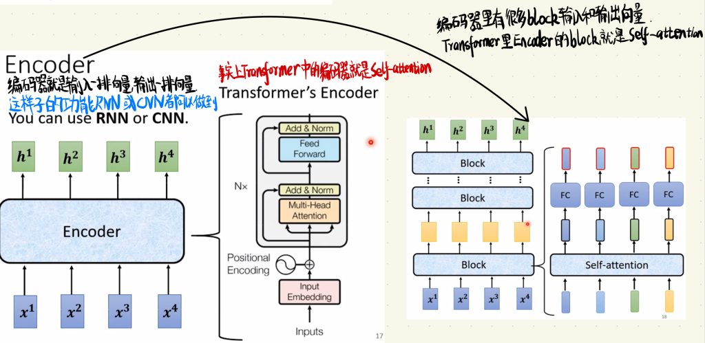 编码器就是输入一排向量,然后输出一排向量。这样子的功能RNN和CNN都可以做到,实际上Transformer中的编码器就是上次说的Self-attention,如果你忘记了Self-attention,这里放一个传送门(【自注意力机制】李宏毅2021/2022春机器学习课程笔记EP11(P38-P39) – -TobyKSKGD的个人博客-)。