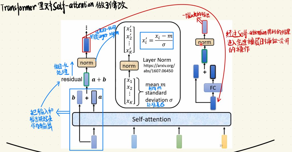 在一个Block里面,Self-attention层里面把输入和输出拼起来作为一个输入,这个输入叫做residual,然后还要对这个参数做一个归一化处理,这里的归一化处理和上一个EP中说的Batch Normalization不一样,这里用到的是更简单的Layer Norm。做法就在黑色框里面,m表示的是向量里元素的平均值,σ指的是向量里元素的标准差,然后归一化算对应的x‘i就可以了。经过Self-attention得到的结果,我们再进入全连接层,然后再做一次和之前一样的操作,最终得到的输出就是编码器里一个Block的输出。