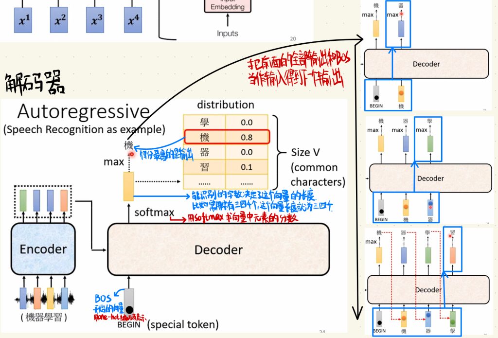 然后需要说的是,解码器中输出的向量是根据前面的全部输出和BOS当作输入得到的。比如上图中,我们根据BOS和“机”得到输出“器”,然后又根据BOS、“机”和“器”得到输出“学”,然后如上图这样一直以此类推。