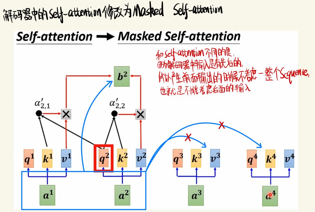 和Self-attention不同的就是,因为解码器中的输入是有先后的,所有产生前面输出的时候不考虑整个Sequence,也就是说不能考虑后面的输入。