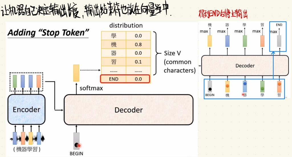 最后,因为我们需要让机器自己决定输出的长度,所以输出结束符也应该放在向量当中。这里就是,如果最终END符得到的分数最高,也就是输出了END符,我们就让解码器停止输出。